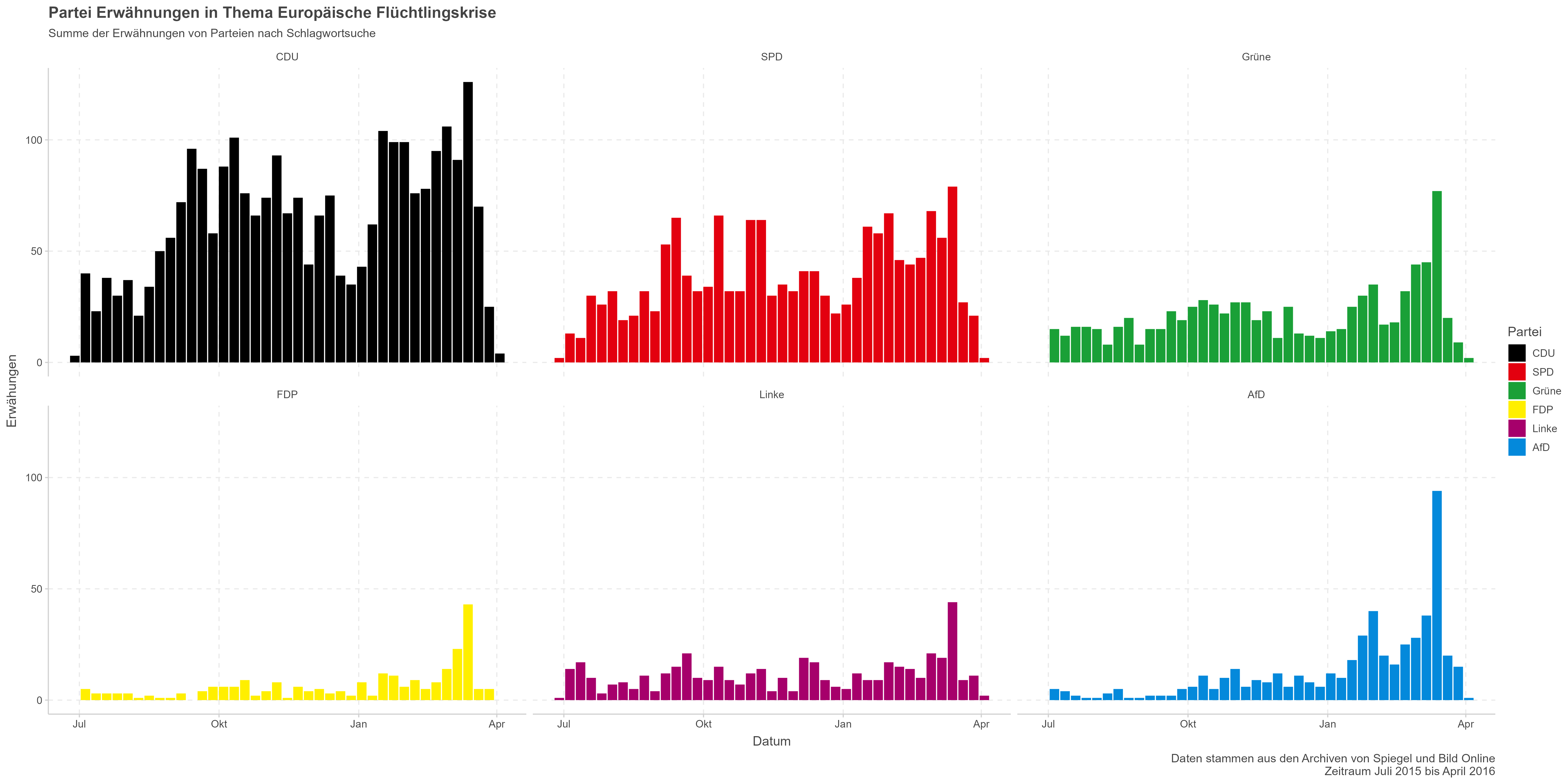 CDU/CSU: As the governing party responsible for refugee policy, the CDU/CSU maintained high mention frequencies throughout the period, with modest increases toward the end as internal party divisions over refugee policy intensified.