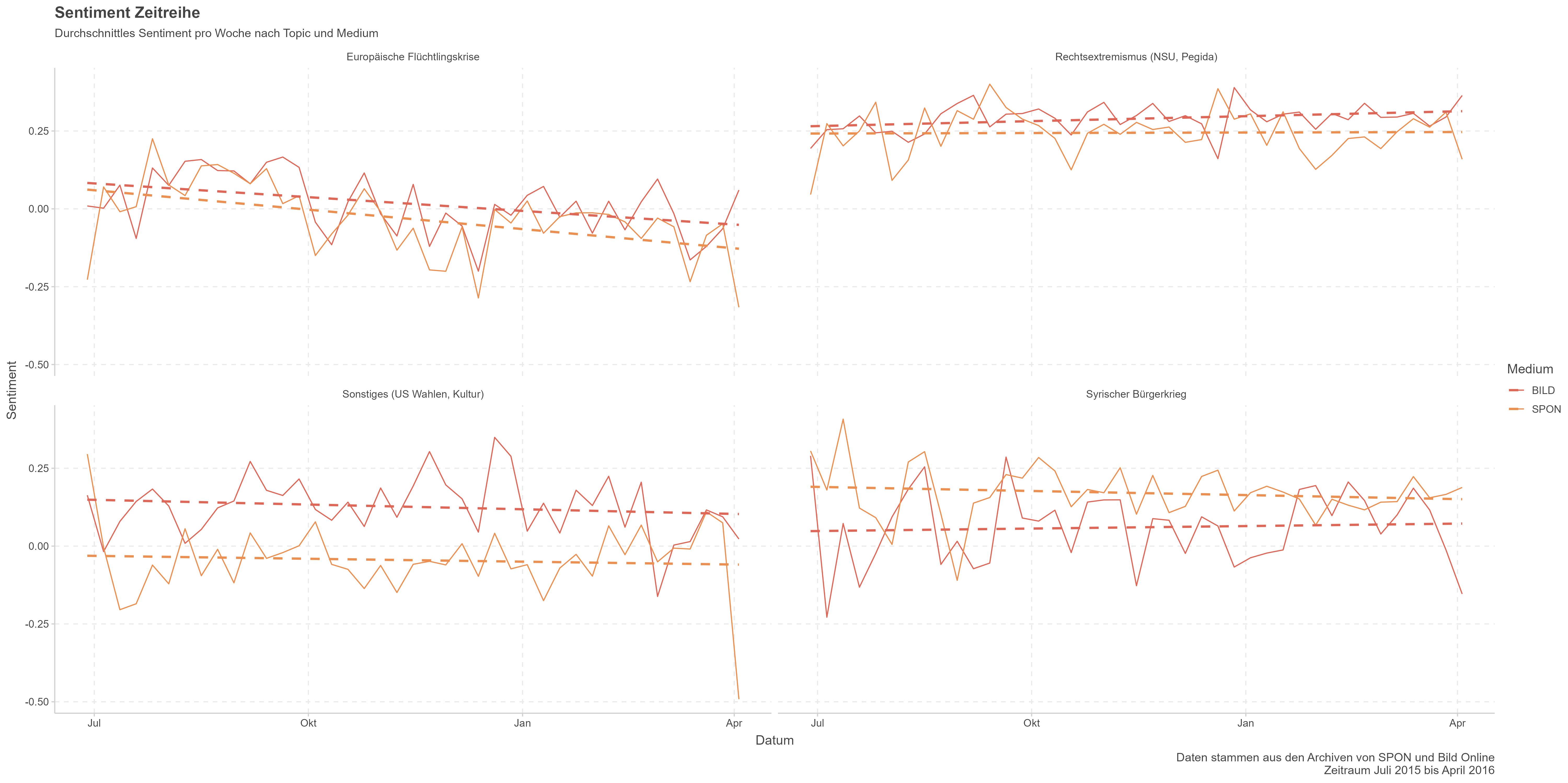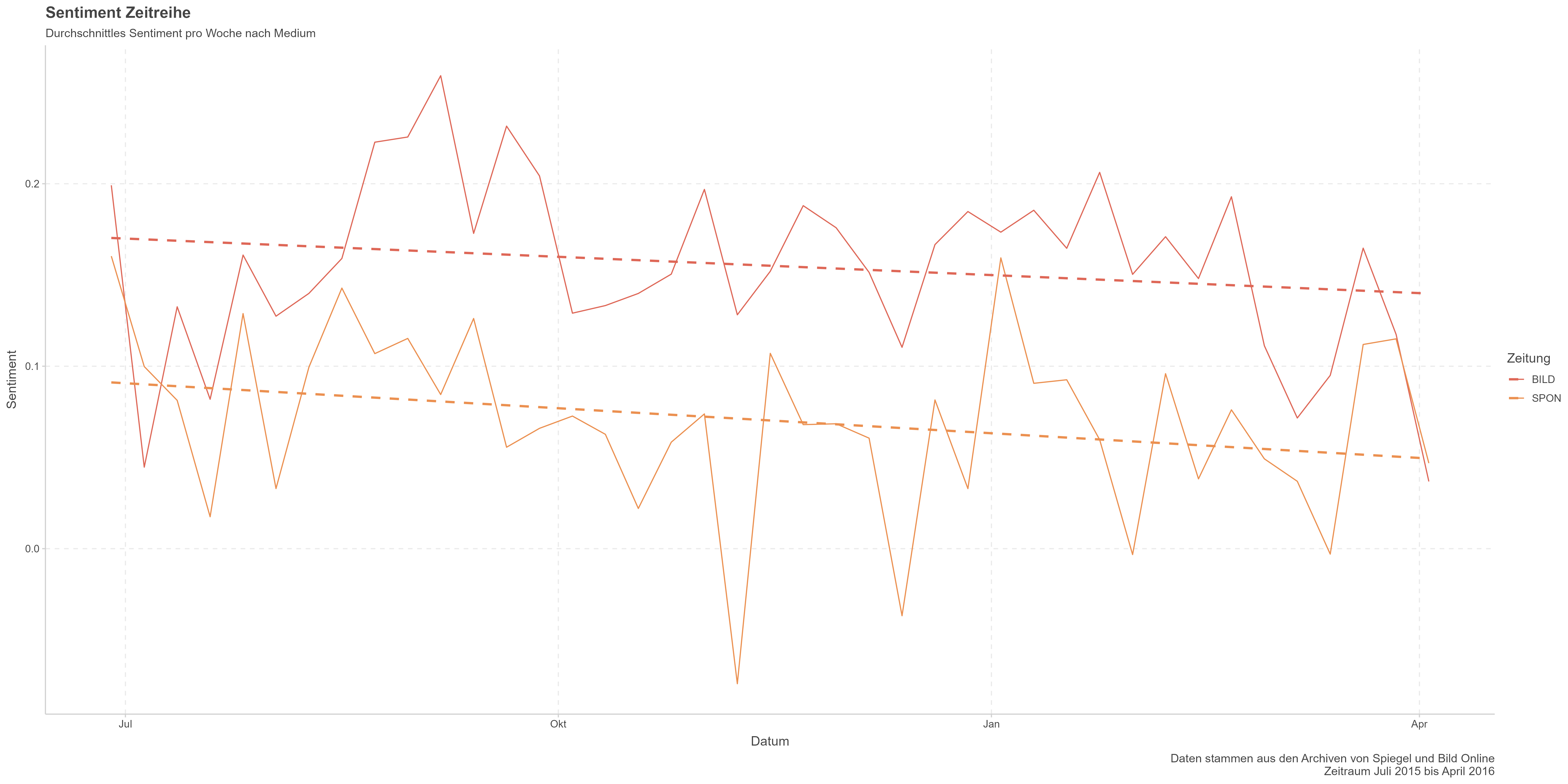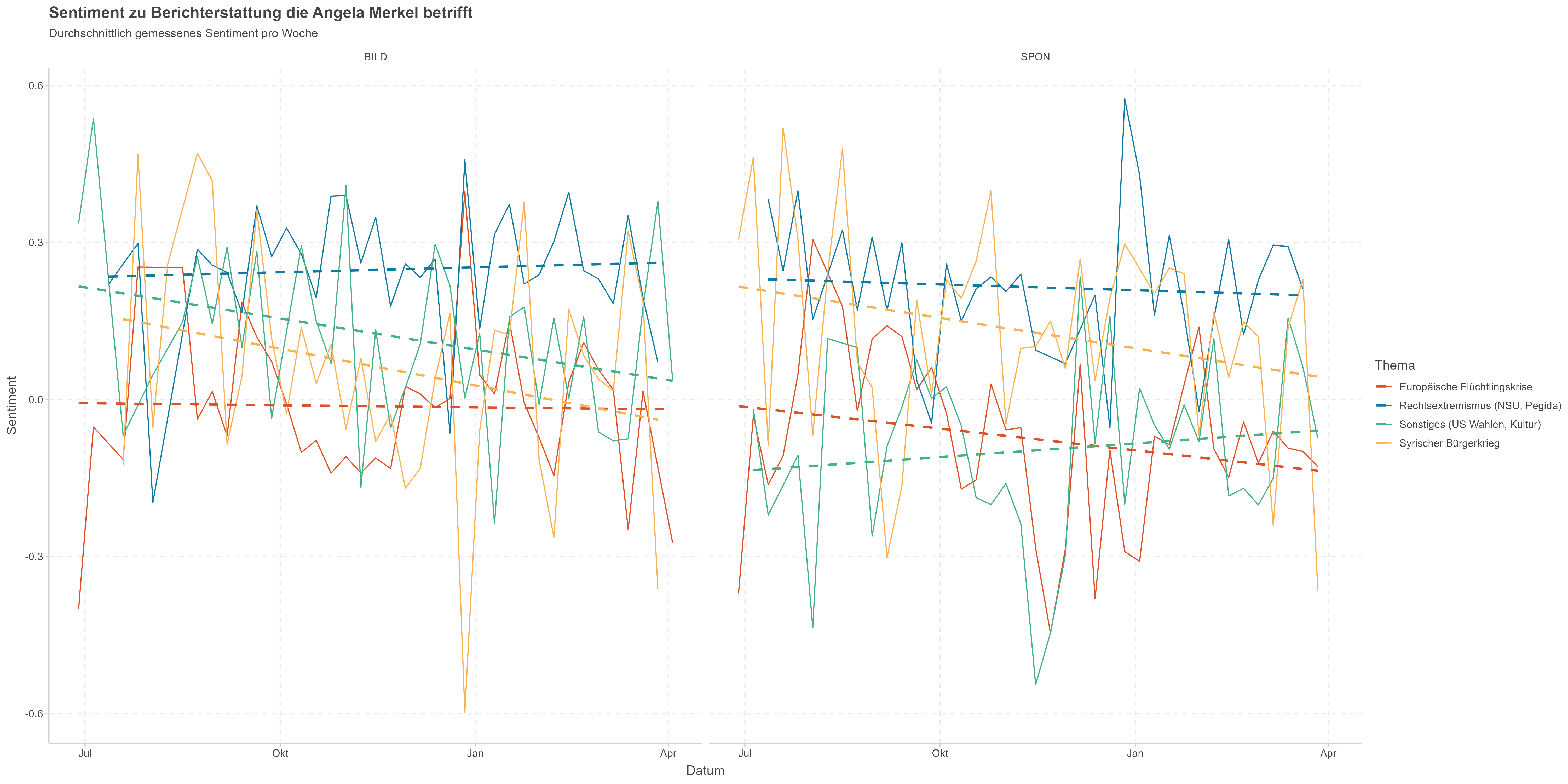 Both publications showed a declining sentiment trajectory, but Bild experienced a more dramatic shift. While the summer of 2015 began with relatively positive coverage (sentiment values around 0.18 for Bild and 0.15 for SPON), by April 2016, the sentiment had significantly declined, with Bild’s average sentiment dropping by approximately 30%.