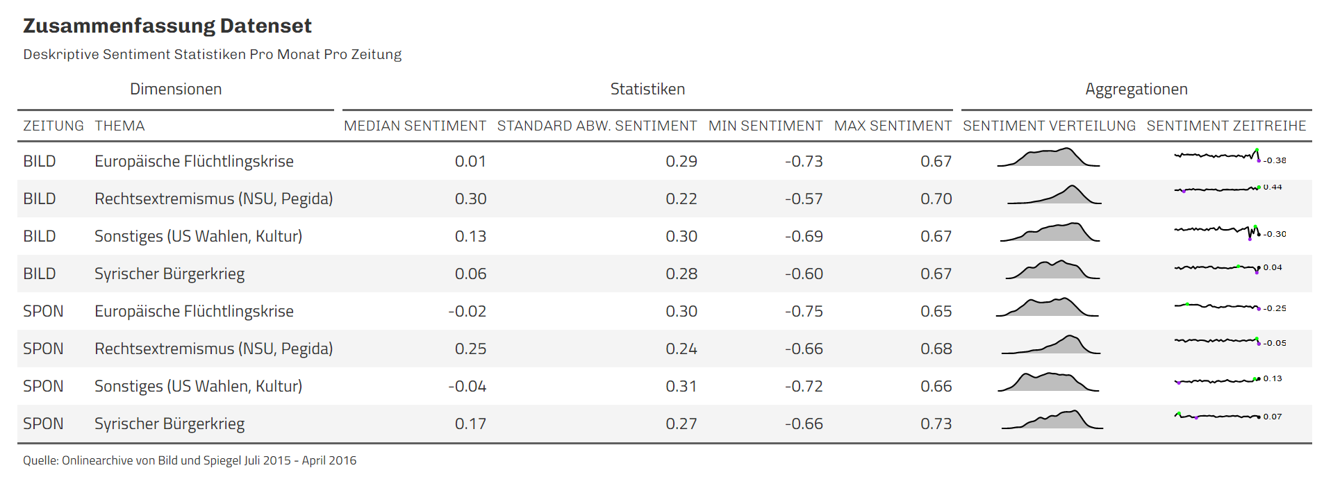My work focused on a central research question: How did the sentiment in German media coverage of refugees evolve during the 2015/2016 crisis? I was particularly interested in comparing coverage between two influential German news outlets with different editorial perspectives: Bild (a tabloid with center-right leanings) and Spiegel Online (SPON, a more liberal-leaning news magazine).