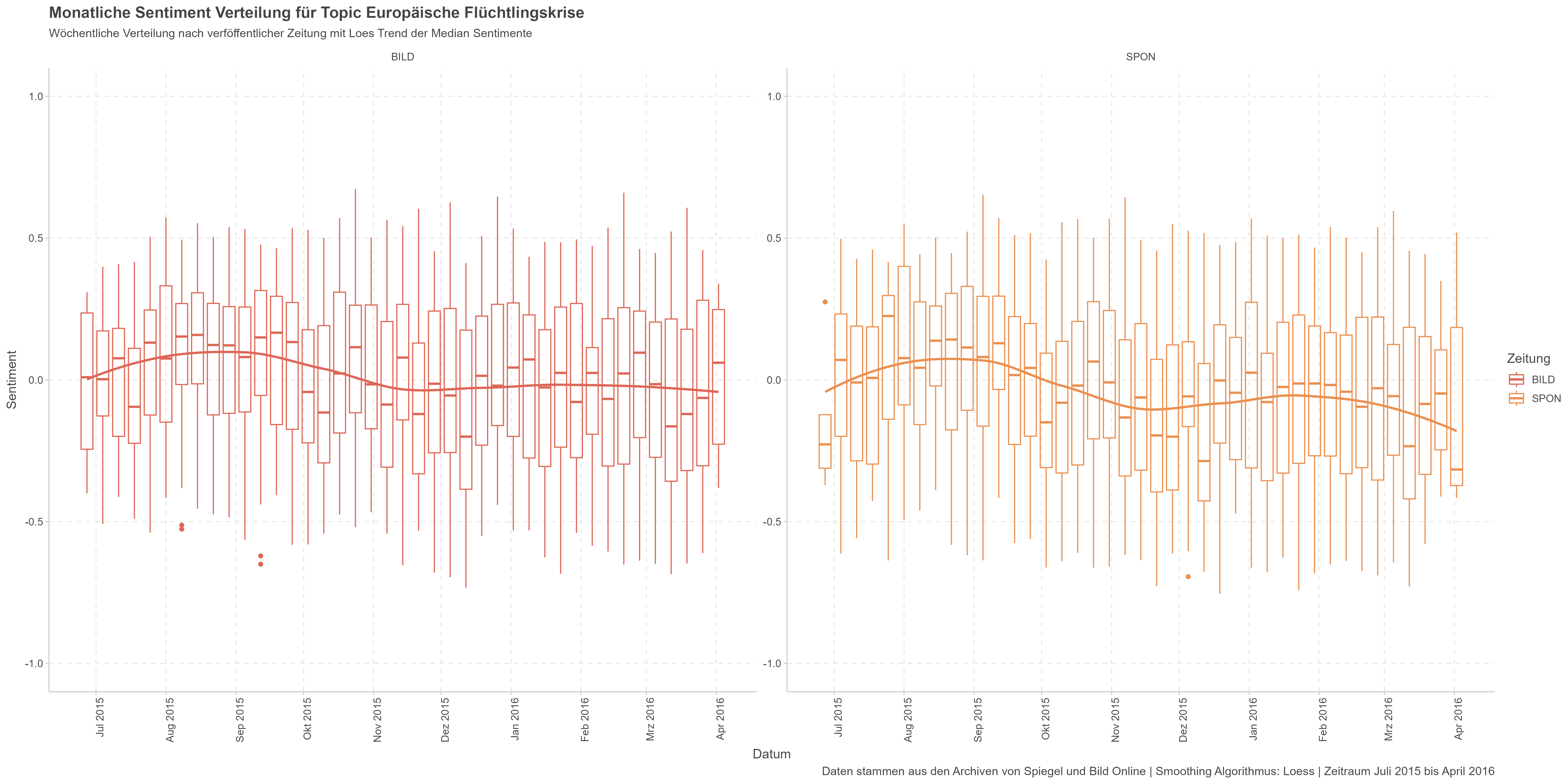 Both publications showed a declining sentiment trajectory, but Bild experienced a more dramatic shift. While the summer of 2015 began with relatively positive coverage (sentiment values around 0.18 for Bild and 0.15 for SPON), by April 2016, the sentiment had significantly declined, with Bild’s average sentiment dropping by approximately 30%.